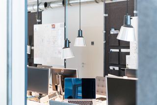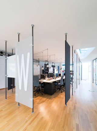 Mit einer simplen Stangenkonstruktion wird der "workspace" offen und locker vom Rest des Raumes abgeschirmt. Transluzente Schallschutzplatten und mit Filz bezogene Platten bilden einen zeitgemäßen Look für ein kreativ arbeitendes Team.